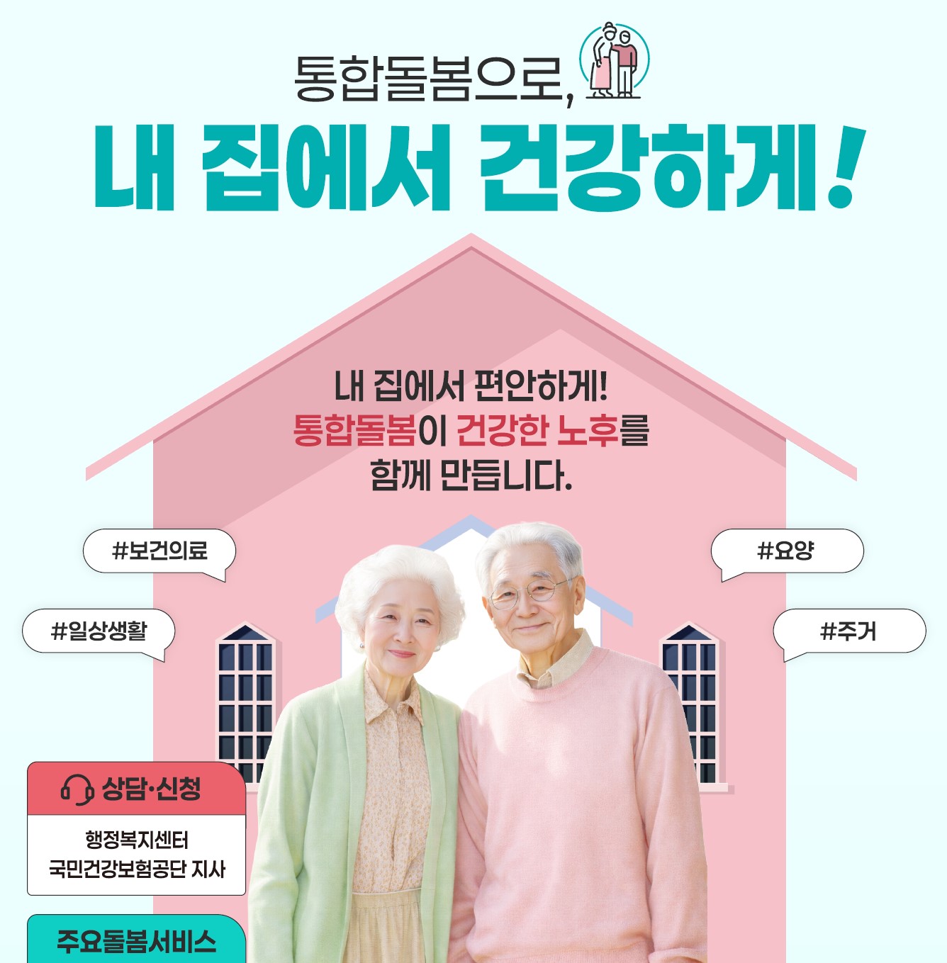 보건의료 분야에서는 방문진료, 방문간호, 재활서비스, 방문 구강관리 등이 제공되고, 장기요양 분야에서는 방문요양, 방문목욕, 주야간 보호, 재택의료센터 연계 서비스를 받을 수 있습니다.