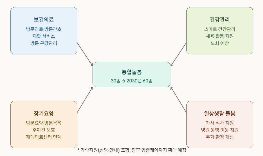 1단계(2026~2027년)에서는 보건의료, 건강관리, 장기요양, 일상생활돌봄 4개 분야에서 30종 서비스를 우선 연계합니다.